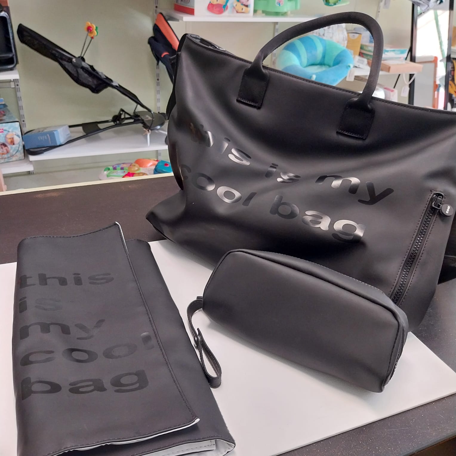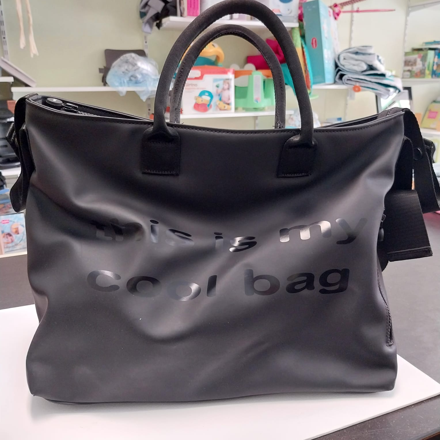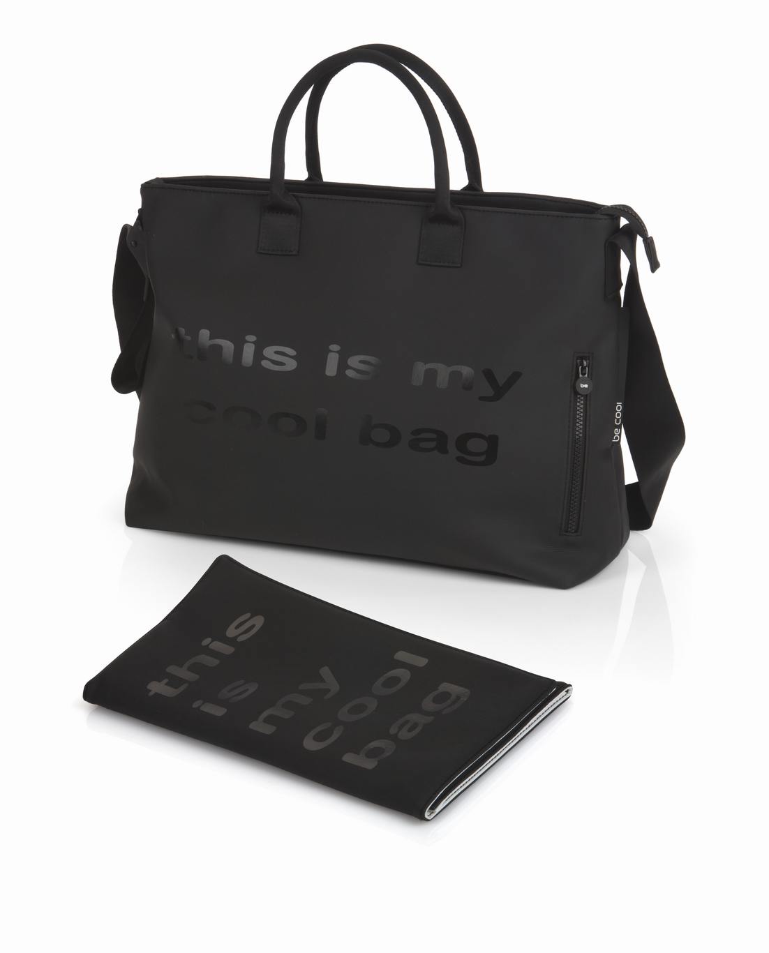 Il materiale soffice e vellutato al tatto si unisce ad una forma moderna e alla scritta “this is my cool bag” che arricchisce questa borsa “very cool” insieme alle tasche di varie misure al portabiberon isotermico ed al piano fasciatoio ripiegabile.