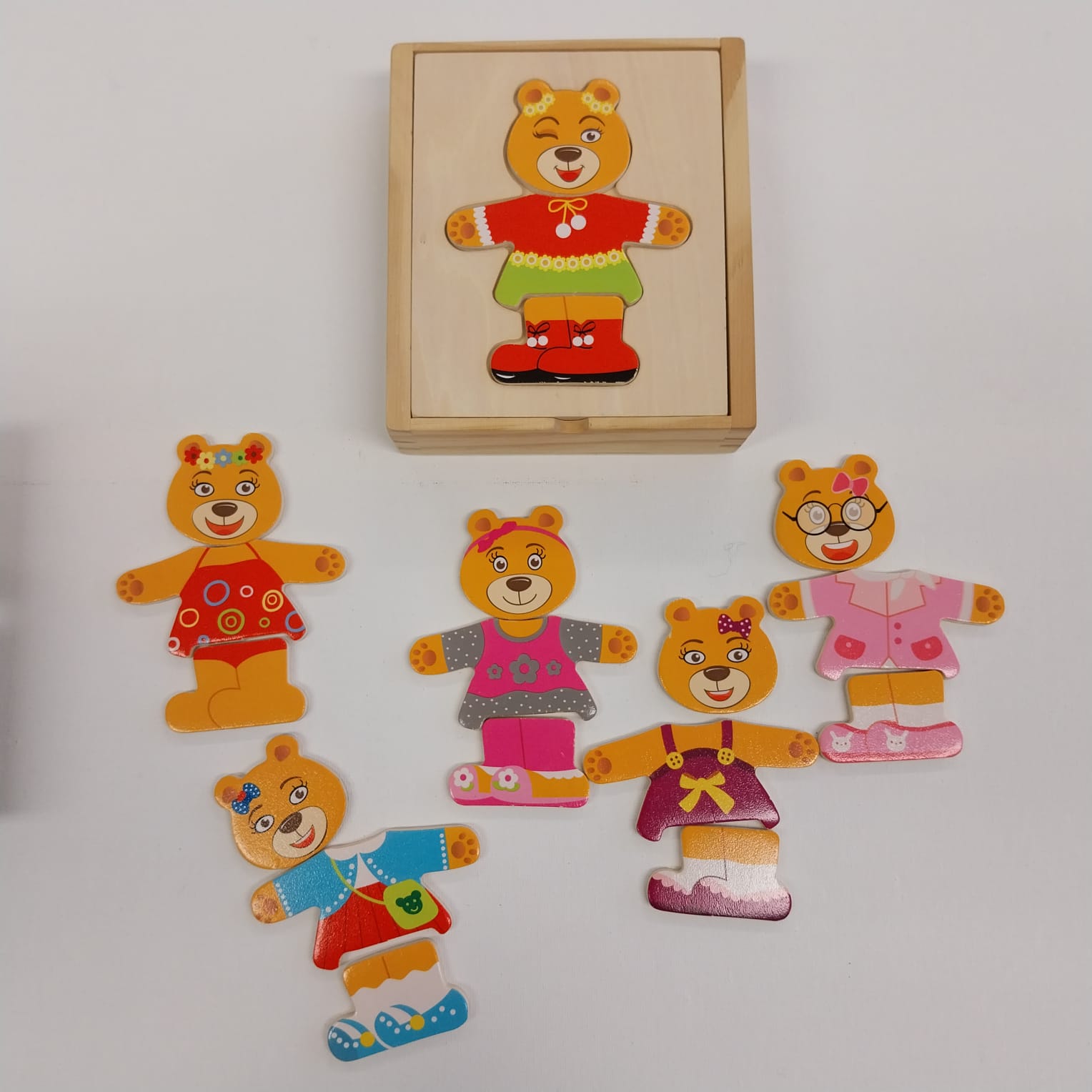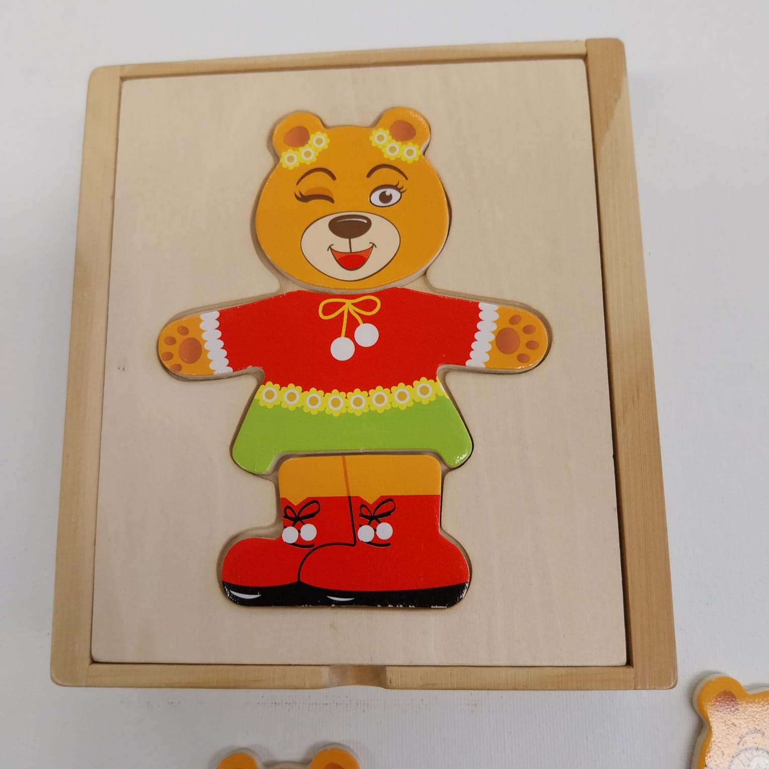 Divertente puzzle da vestire in una scatola di legno colorato.
