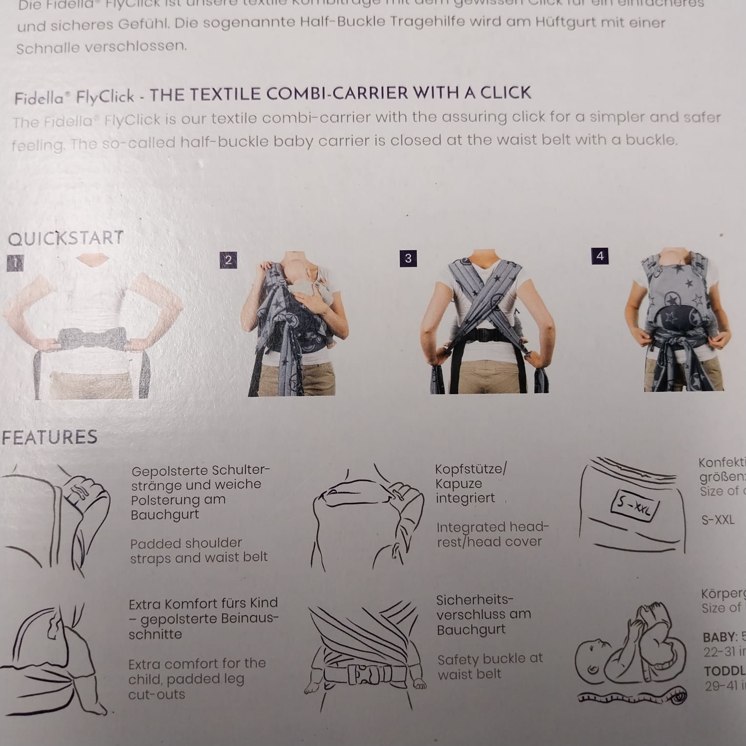 Il FlyClick - Marsupio ergonomico - può essere portata in tre posizioni ergonomiche: sulla pancia, sulla schiena o sul fianco.