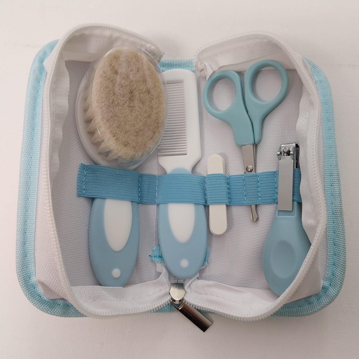 Set per la cura del bambino da 5 pezzi in borsa richiudibile bianca e azzurra