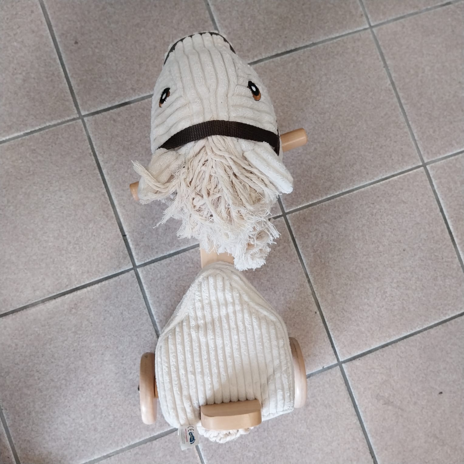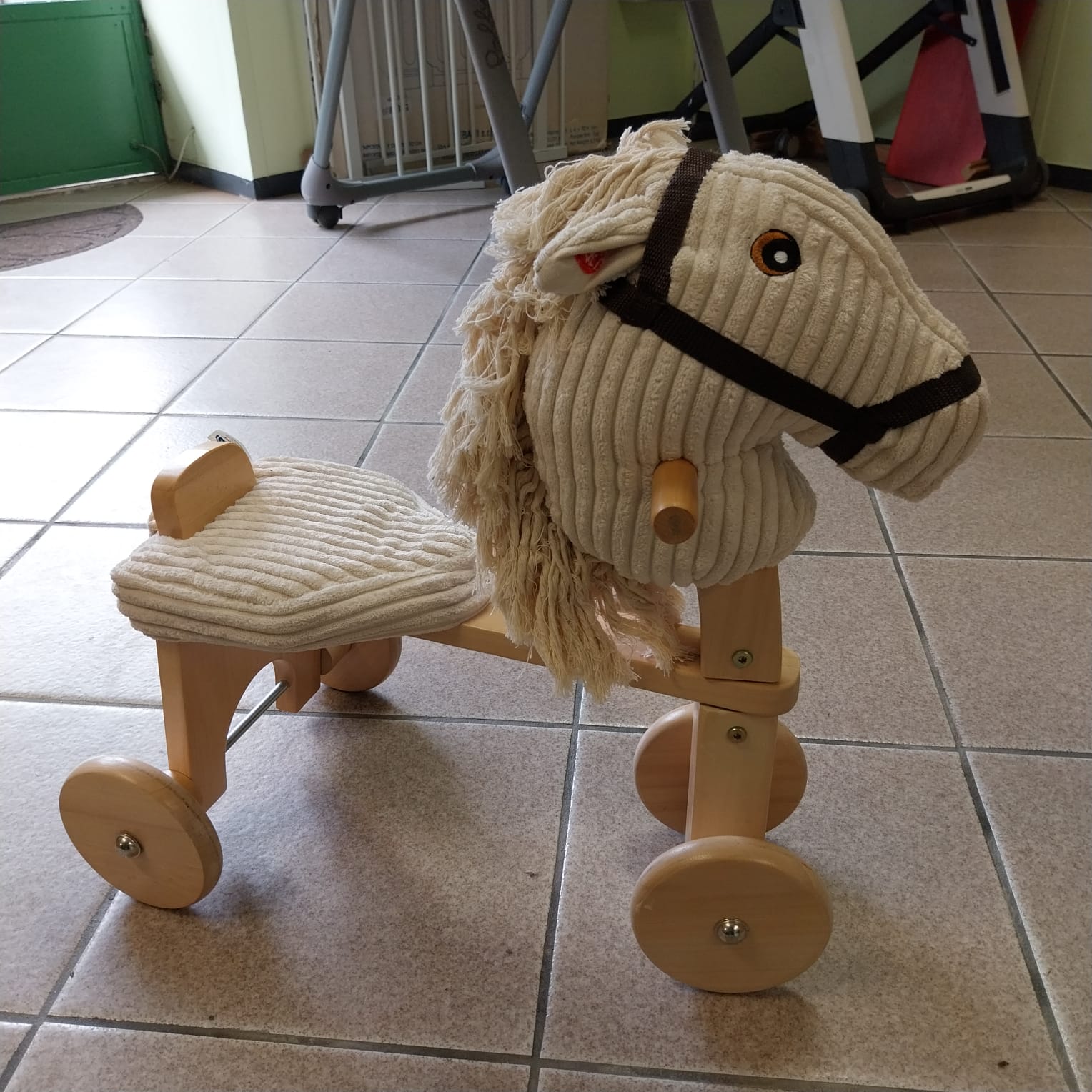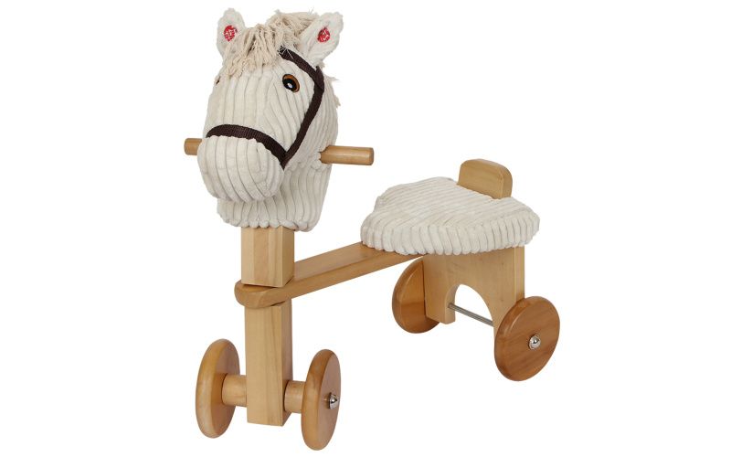 Fredo è un cavallo maestoso. Se gli si schiacciano le orecchie, si possono sentire nitriti e galoppi. La sella e la testa imbottite di questa graziosa bici senza pedali in legno sono realizzate in morbido velluto a coste.