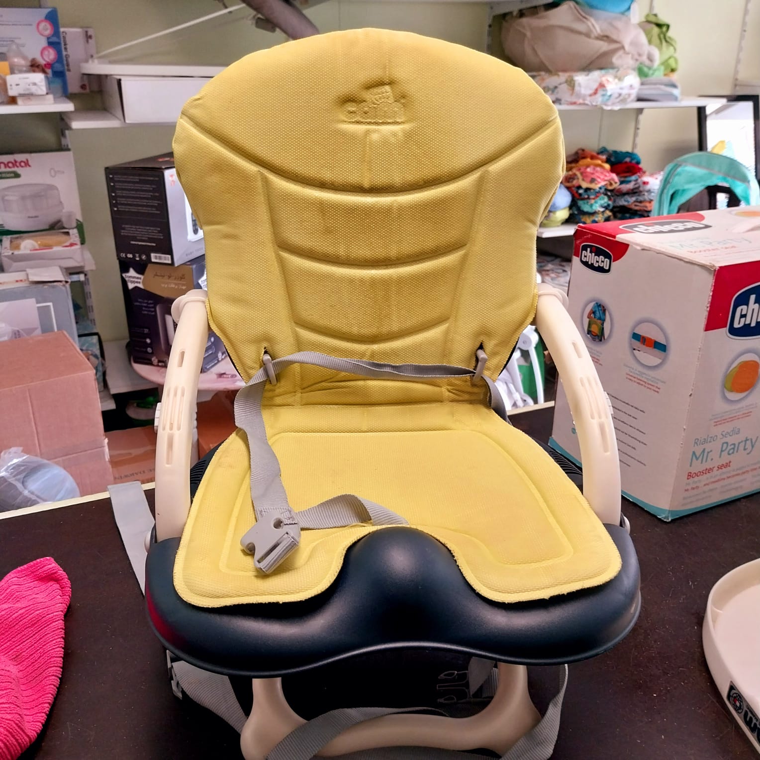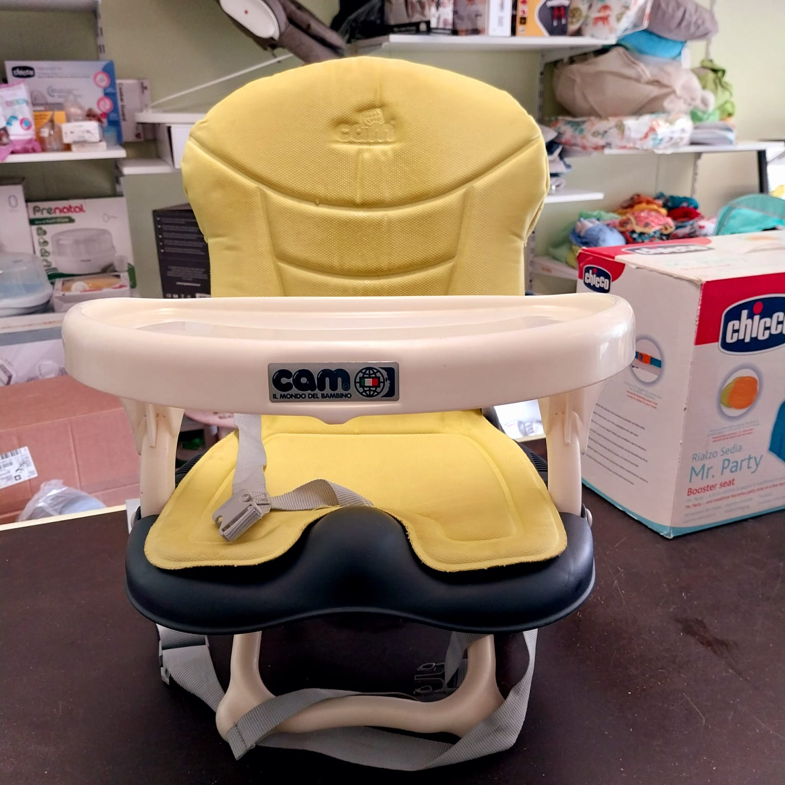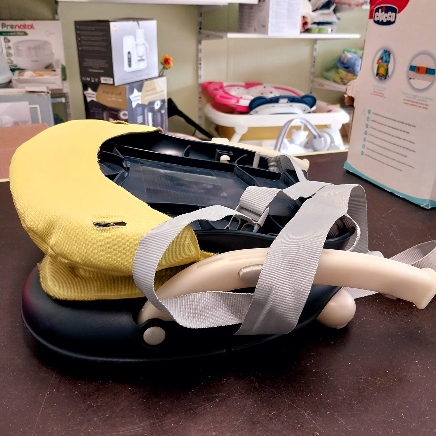 Fissaggio universale alla sedia con set di cinghie regolabili, tavoletta removibile, seduta anatomica, cinghia a 3 punti, chiusura ultracompatta.